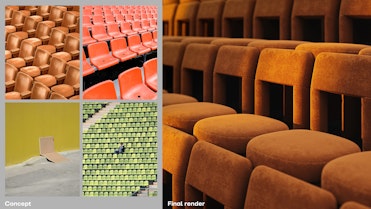 In locations brimming with activity — cinemas, stadiums, and theaters — the design concept thrives amidst the hustle and bustle. Here, rich textures like vintage velour and the interplay of colors evoke a sense of nostalgia while juxtaposing against the vibrant. This contrast underscores the sophisticated charm of the materials, showcasing their unique appeal in a dynamic urban setting.