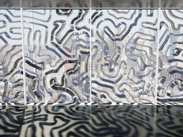 In what is known as "biomimicry," this facade system responds to outdoor circumstances such as light and heat to assist the structure in maintaining desirable internal conditions. This system is made up of a dielectric ribbon (a polymer that reacts to electric impulses) wrapped in a double glass façade. Both sides of the material are covered with silver, which reflects light and distributes electricity across the surface, allowing it to morph to meet the needs of the structure.